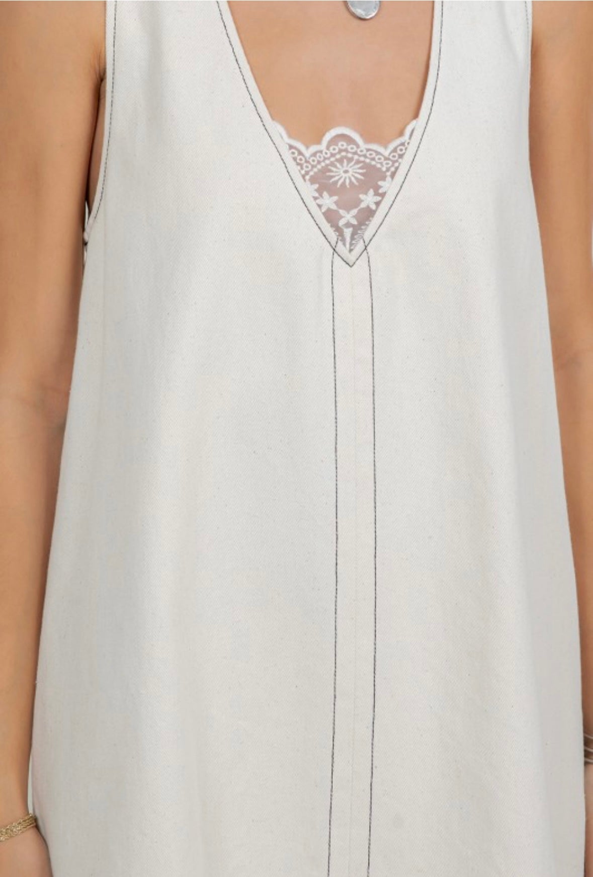 DENIM WASHED CONTRAST LACE INSERT SHIFT DRESS.