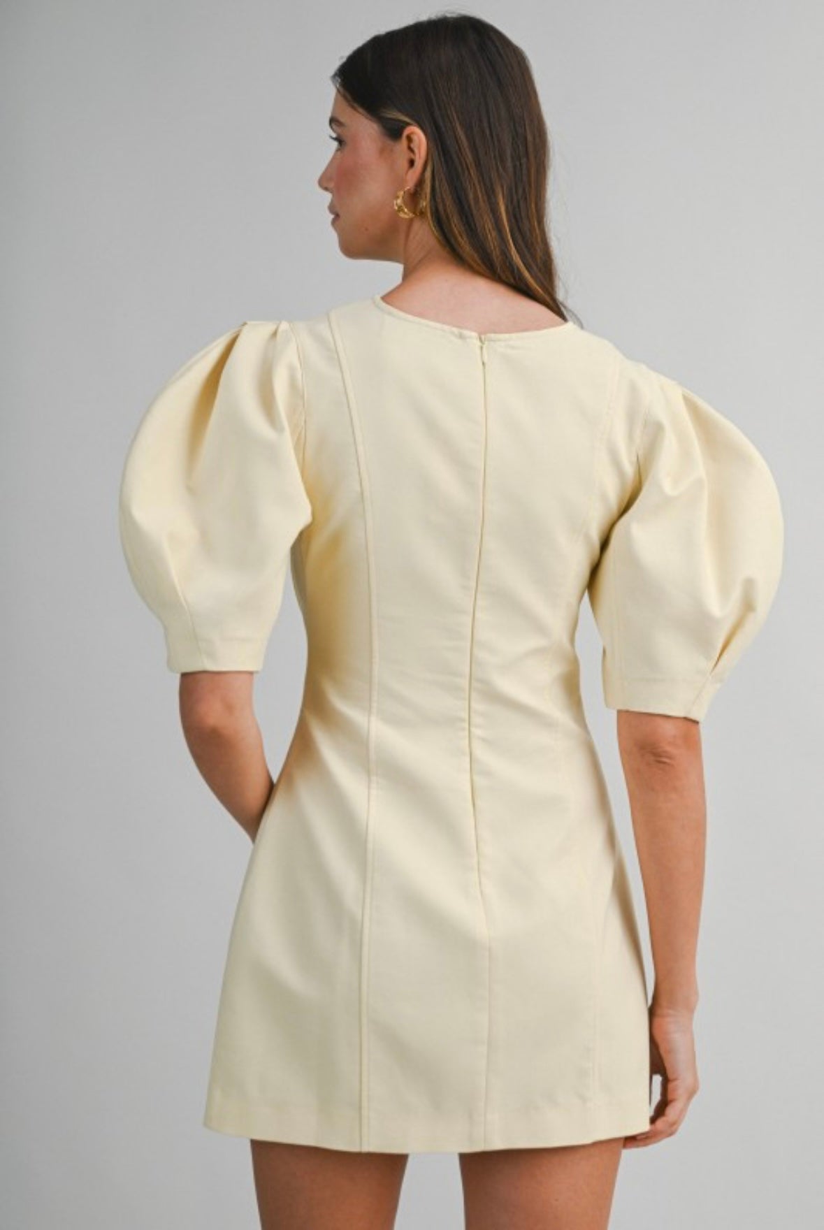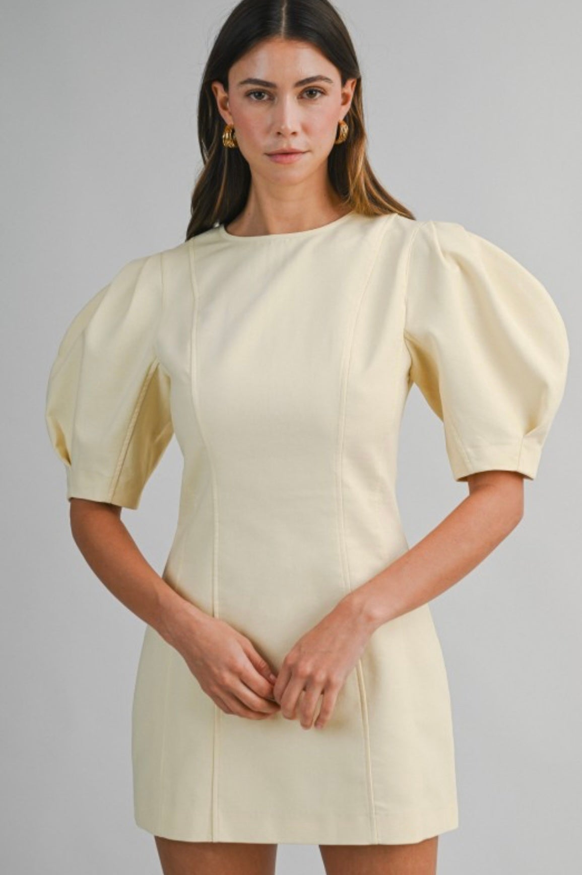 Woven mini dress featuring a round neckline. Short puff sleeves with structured volume. Fitted bodice with vertical panel seam construction. Back invisible zipper closure.