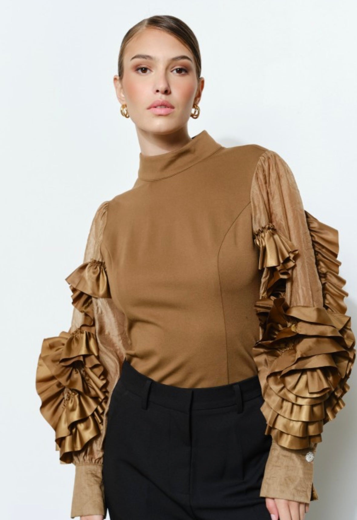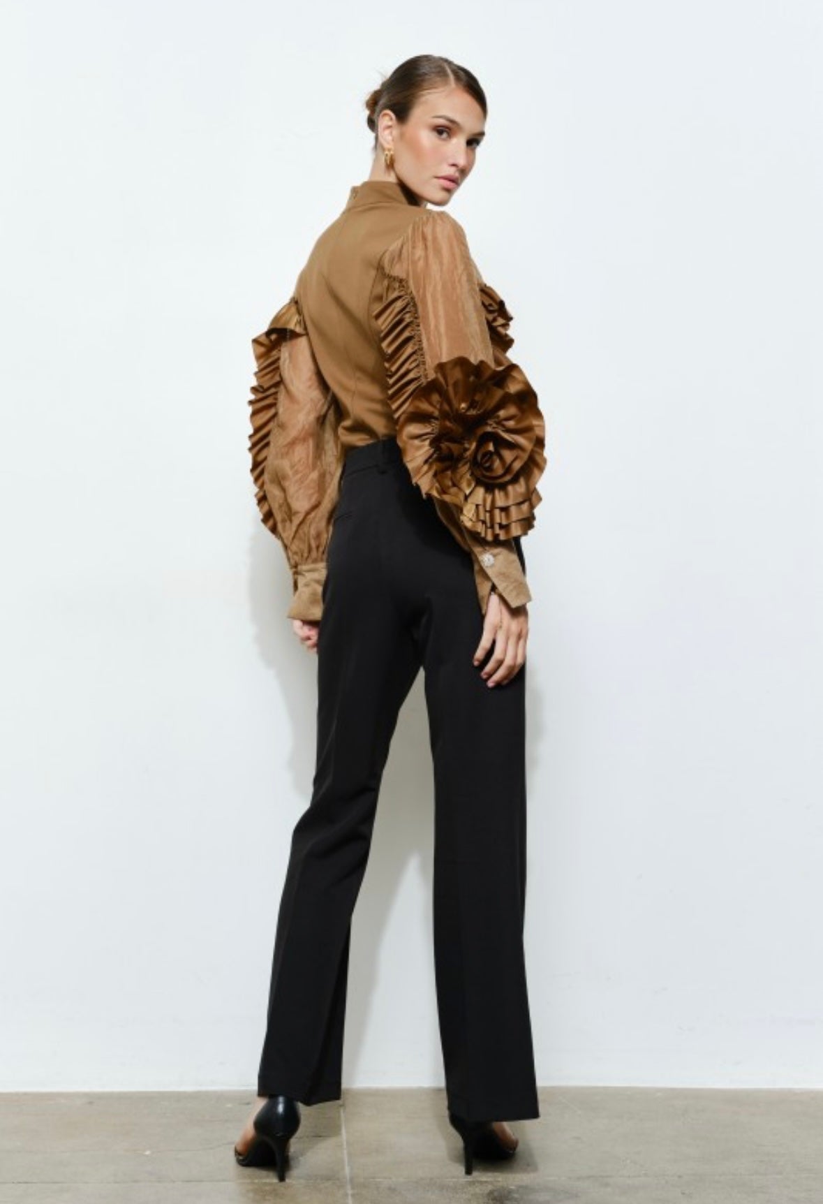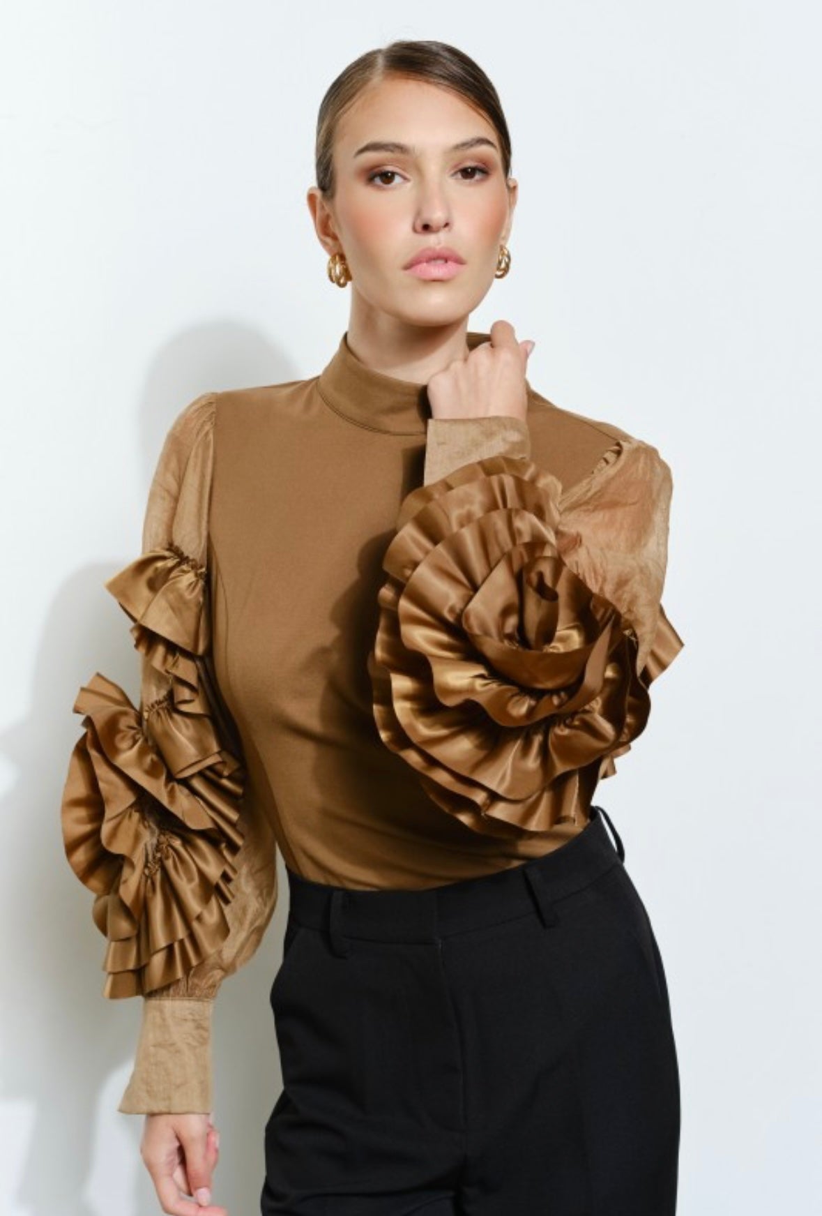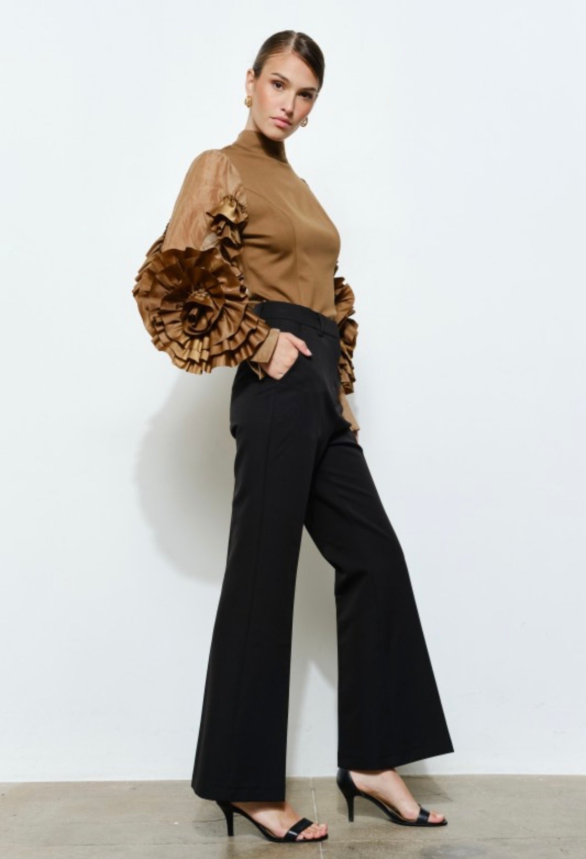 Rosette Ruffle Sheer Sleeve Jersey Top