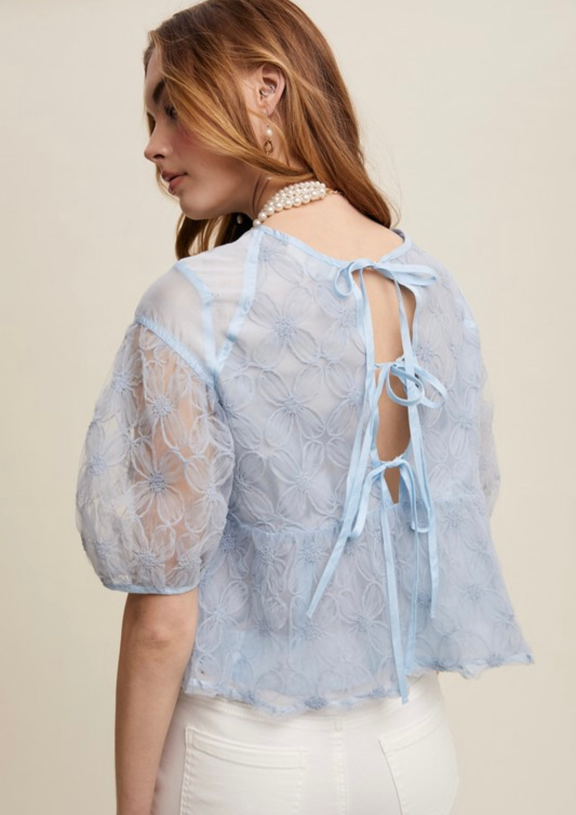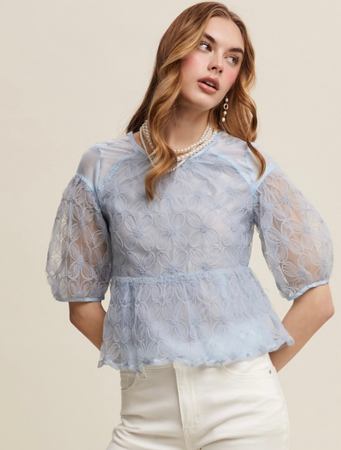 Floral Embroidered Sheer Peplum Blouse.