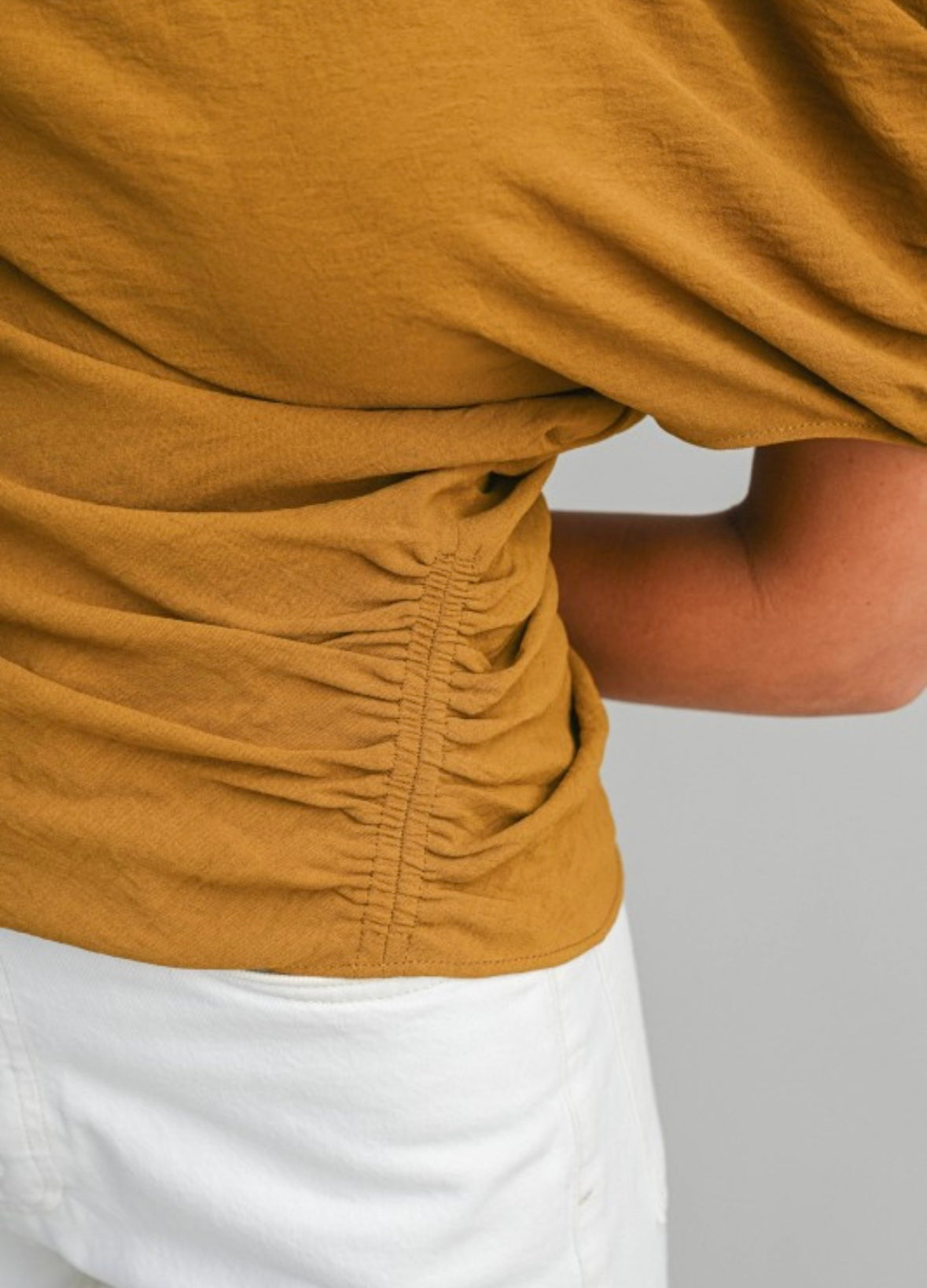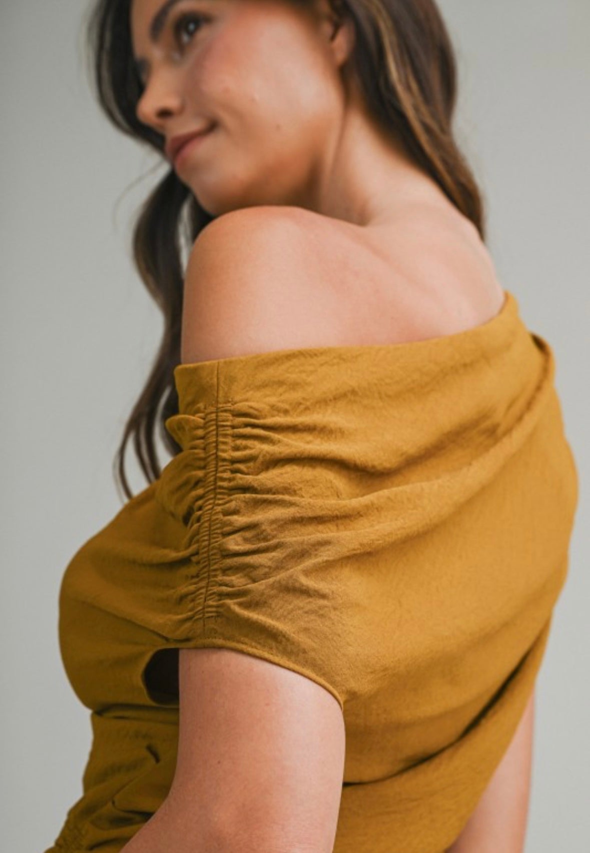 Solid asymmetric one shoulder top with soft draped neckline detail. Short dolman style sleeves and side ruched detail.