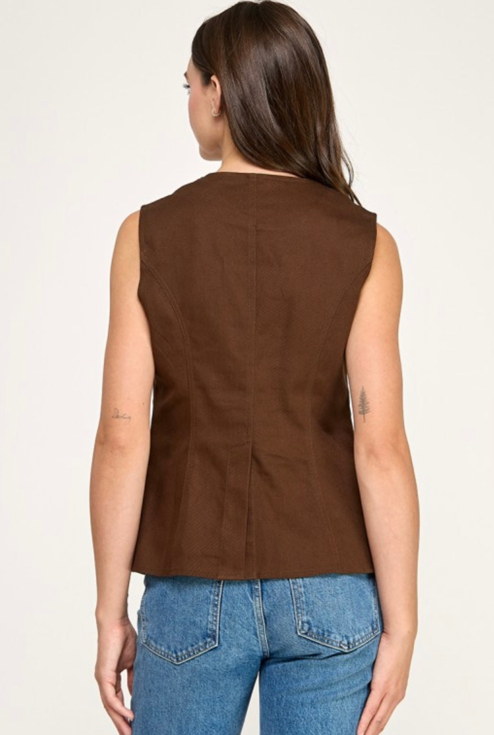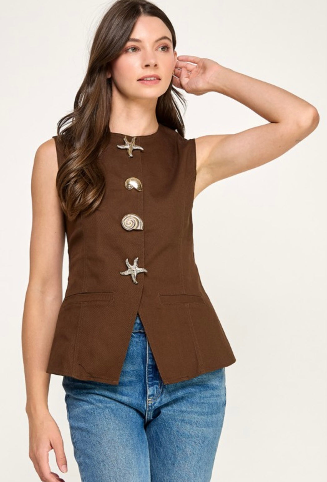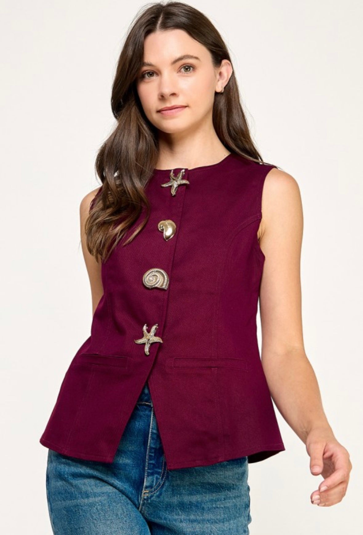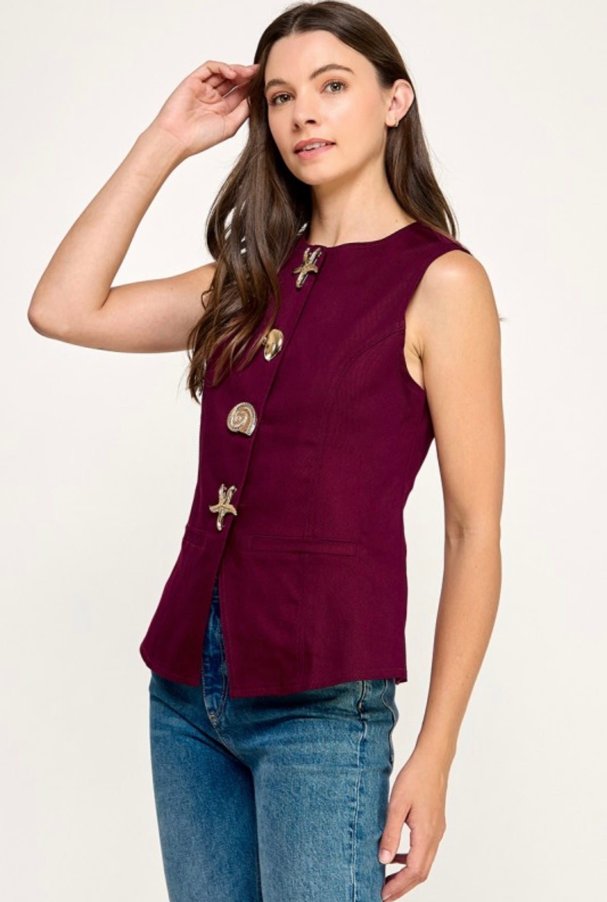 SLVLESS METAL BUTTON DETAIL SHIRT.