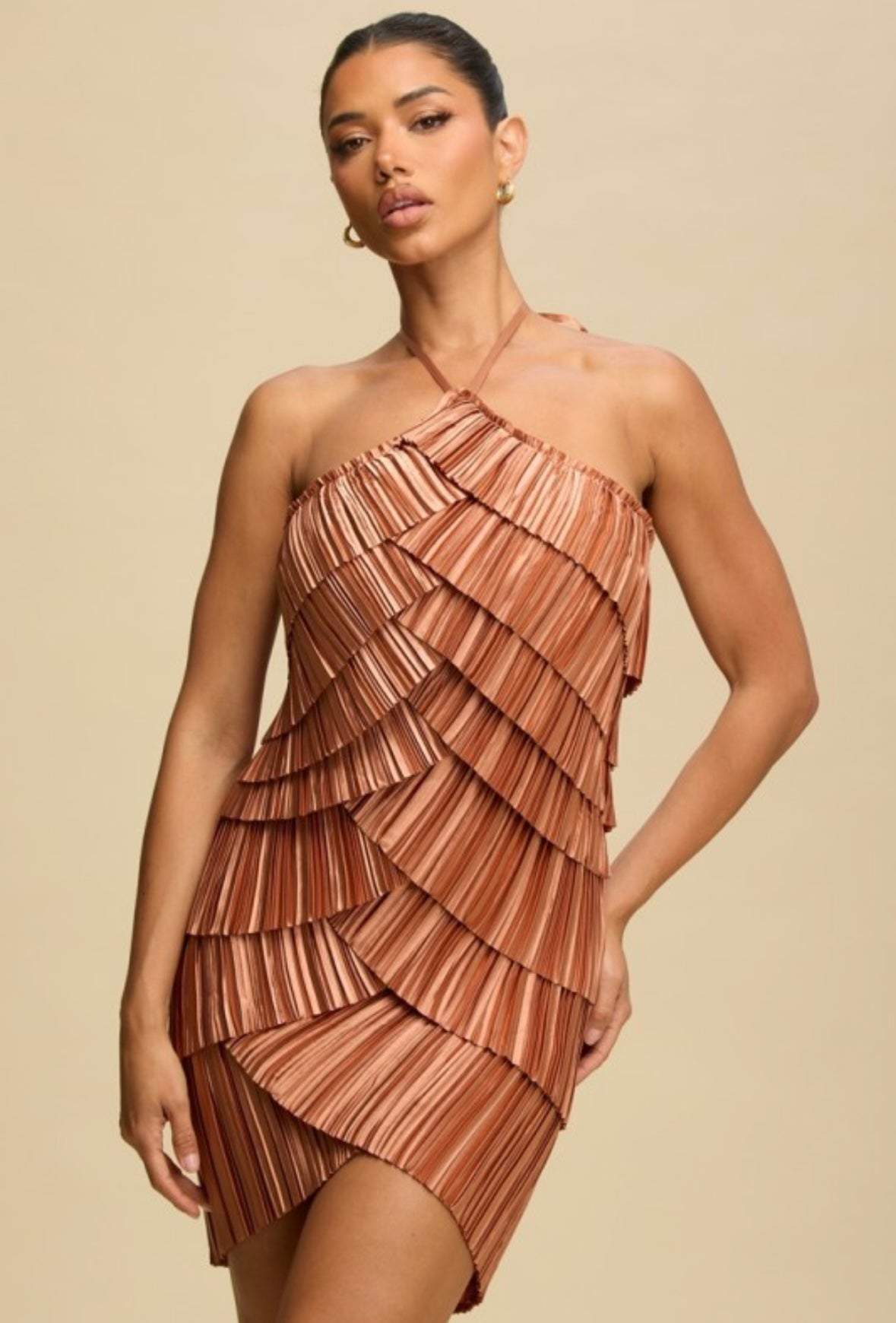 Copper Pleated Layers Mini Dress